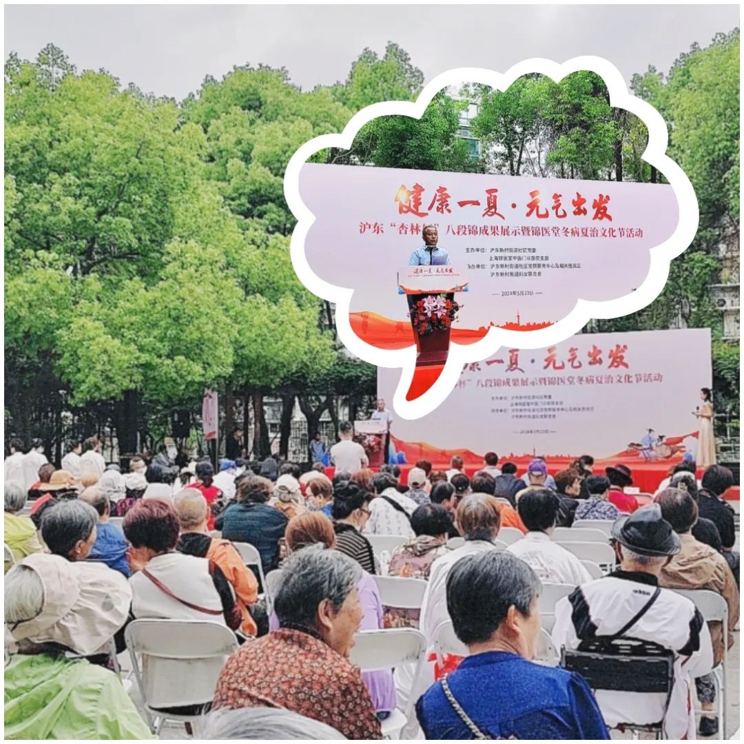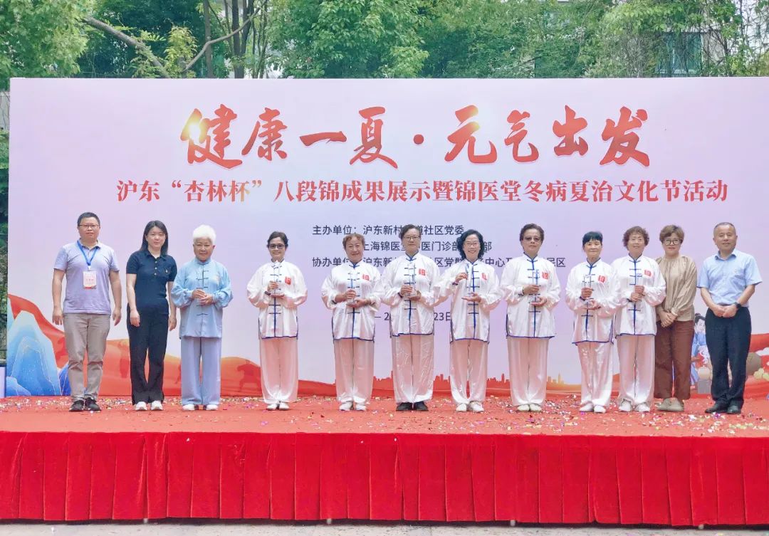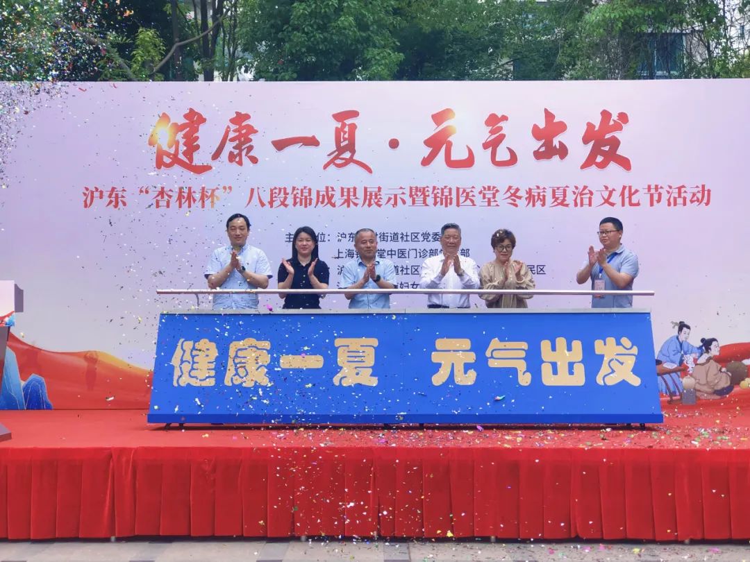 传承文化强体魄,全民健身促健康,5月23日,“健康一夏·元气出发”沪东“杏林杯”八段锦成果展示暨锦医堂冬病夏治文化节活动在沪东党建广场隆重举办。沪东新村街道社区党委副书记王连生、沪东新村街道妇女联合会主席彭晓明、沪东新村街道社区党群服务中心主任陈佩丽、沪东新村街道社区党群服务中心副主任杨寅、济德中医连锁机构总院长陈令霄、上海锦医堂中医门诊部院长姚玉民等领导,以及沪东新村街道8个社区代表和居民共200多人参加了本次活动。