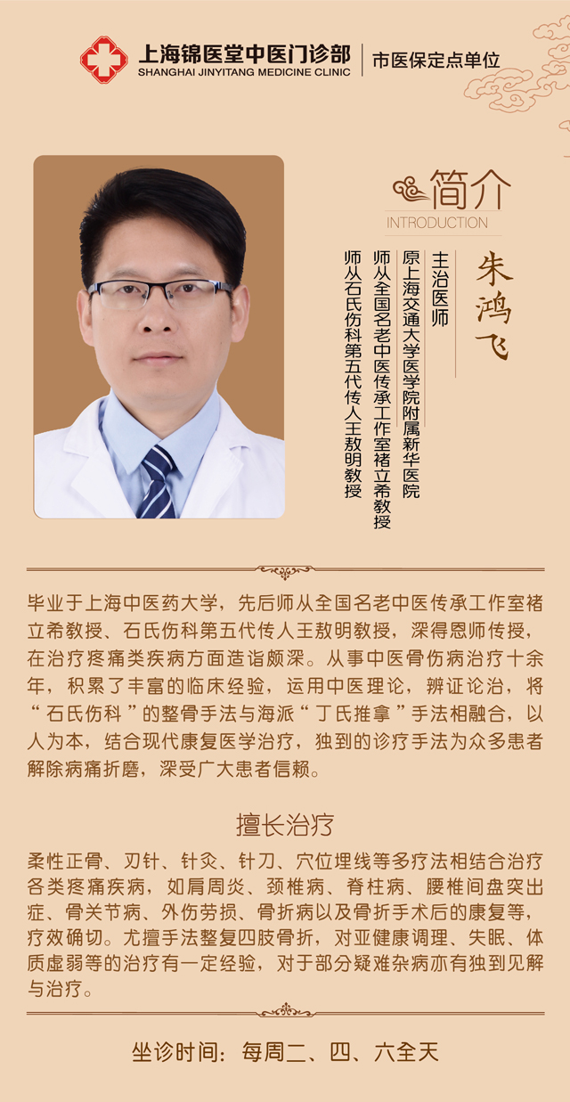 毕业于上海中医药大学,先后师从全国名老中医传承工作室褚立希教授、石氏伤科第五代传人王敖明教授,深得恩师传授。从事中医骨伤病治疗十余年,积累了丰富的临床经验,运用中医理论,辨证论治,将“石氏伤科”的整骨手法与海派“丁氏推拿”手法相融合,以人为本,结合现代康复医学治疗,手法独到。